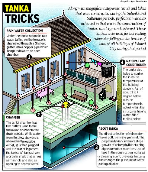 To understand the working and the construction of tankas, the systems at two houses in Dhobi-ni-Pol were documented and eight other tankas at various areas in the walled city were also studied. “Going by a conservative estimate of 25,000 litre of water per tanka, there is a potential to harness 25,00,00,000,00 litres per year in the walled city,” the research says. “Hence, the revival of ancient wisdom will have far-reaching positive repercussion.”
