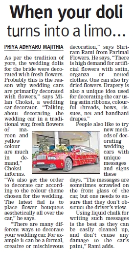 As per the tradition of yore, the wedding dolis for the bride were decorated with fresh flowers. Probably this is the reason why wedding cars are primarily decorated with flowers,” says Milan Choksi, a wedding car decorator.