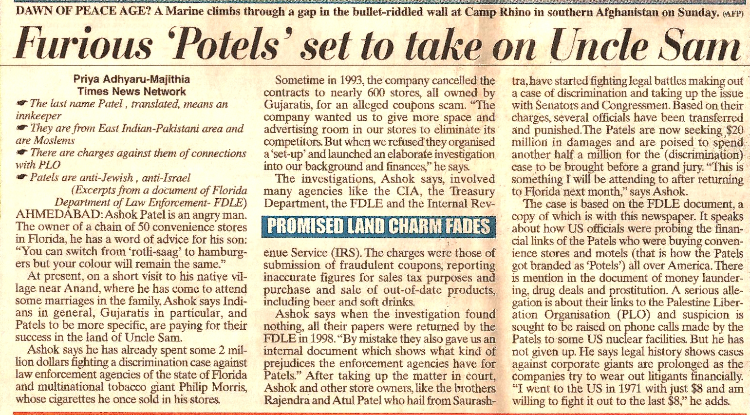 Ashok Patel is an angry man. The owner of 50 convenience stores in Florida, he has a word of advice for his son : ” You can switch from ‘rotali saag’ to hamburgers but your color will remain the same’