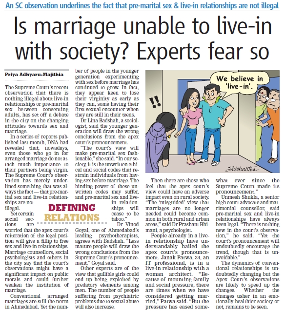 The Supreme Court’s recent observation that there is nothing illegal about live-in relationships or pre-marital sex between consenting adults, has set off a debate in the city on the changing attitudes towards sex and marriage.