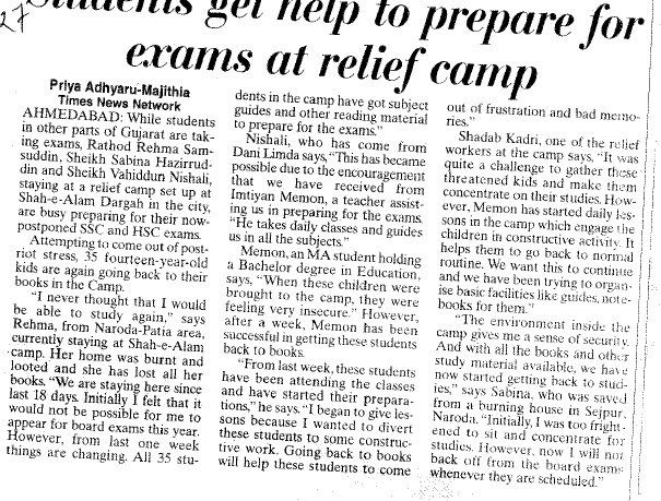 While students in other parts of Gujarat are taking exams, Rathod Rehma Samsuddin, Sheikh Sabina Hazirrudin and Sheikh Vahhiddun Nishali, staying at relief camp set up at Shah-e-Alam Dargah in the city